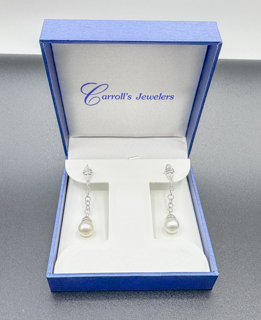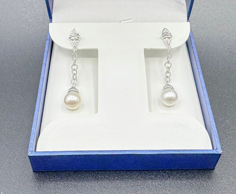 14Kt White Gold and cultured Pearl and Diamond Drop Styled Earrings. Two 8.7 5/9 mm cultured Akoya Pearl drop from textured link chain. 18 total round brilliant cut diamonds = .12 ct. total weight pave-set. Earrings are 14 kt white gold throughout with 4.4 dwt. Posts are fit with friction style white gold earring backs. Packaged with receipt of donation and description of value.